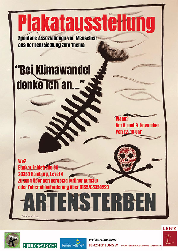 Die Folgen des Klimawandels werden zunehmend auch in Hamburg spürbar. Hochhaussiedlungen können zu Hitzeinseln werden oder Schaden nehmen bei Starkregenereignissen. Der Verein Lenzsiedlung e.V. widmet sich in seiner Arbeit auch dem Thema Klimaresilienz. Zu verschiedenen Anlässen hat der Verein die Bewohner*innen der Lenzsiedlung eingeladen, ihre Assoziationen zum Klimawandel mit dickem Pinselstrich zu zeichnen. So sind 50 Tafeln entstanden, die auf eindrückliche Weise zeigen, wie das Thema Klimawandel in der Gedanken- und der Gefühlswelt der Menschen verankert ist. Am Wochenende (8./9. November) sind diese Tafeln in einer öffentlich zugänglichen Ausstellung zu besichtigen. Die Vereine Hilldegarden e.V. und Lenzsiedlung e.V. werden vor Ort vertreten sein und Informationen für Interessierte bereitstellen.